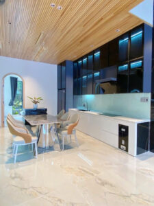 Toàn bộ nội thất nhập khẩu cao cấp: sofa, giường tủ, bàn ăn, bếp, thiết bị vệ sinh. Gia chủ chỉ cần xách vali vào ở ngay mà không cần mua sắm thêm.