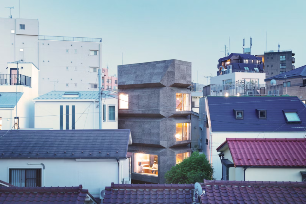 Với mặt bằng 44 m2 và giới hạn xây dựng nghiêm ngặt, nhóm thiết kế đã chọn cấu trúc nhà dạng khối xếp chồng, bố trí các cửa sổ lớn dạng đệm (bay window) tại các tầng. “Bay window” là một kiểu cửa sổ nhô ra khỏi tường chính của tòa nhà, tạo thành một phần không gian mở rộng vào trong phòng, giúp đón nhiều ánh sáng tự nhiên và tạo tầm nhìn bao quát ra bên ngoài.