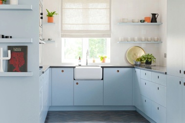 Sử dụng gam màu sáng: Gam sáng như trắng, kem, be, xanh nhạt hay xanh pastel có khả năng phản xạ ánh sáng rất tốt, giúp căn bếp trông rộng và thoáng hơn. Nếu yêu thích tông tối, hãy chỉ dùng cho một mảng nhấn như tủ dưới hoặc tường bếp để tạo chiều sâu mà không khiến phòng bị nặng nề.