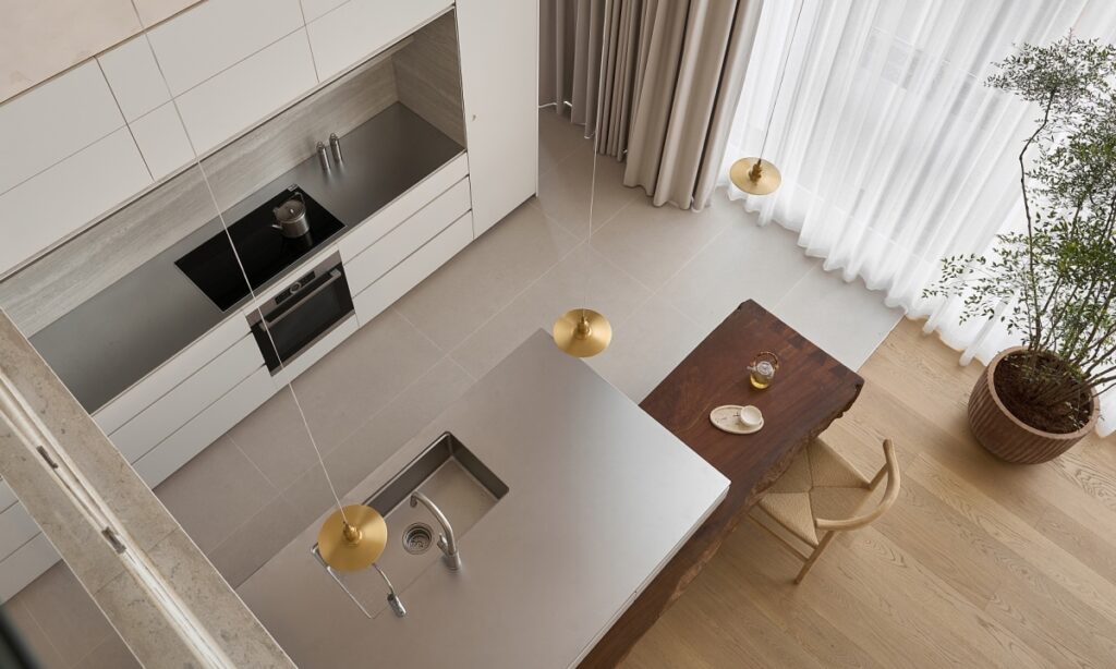 Bề mặt inox phẳng mịn phản chiếu ánh sáng, tạo điểm nhấn sang trọng và dễ bảo trì trong không gian bếp hiện đại. Ảnh: T&PAC Architects