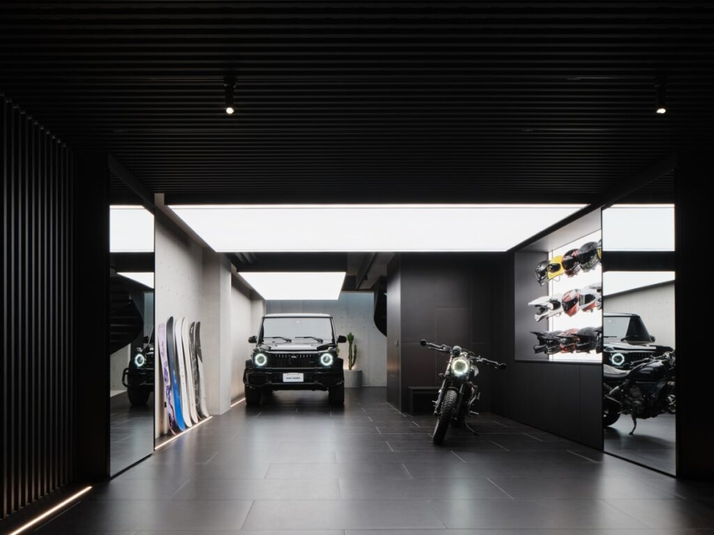 Giếng trời trung tâm đóng vai trò là trục chiếu sáng và thông gió chính. Không gian này giải quyết bài toán điều hòa vi khí hậu cho ngôi nhà, và giúp định hình trục giao thông đứng.