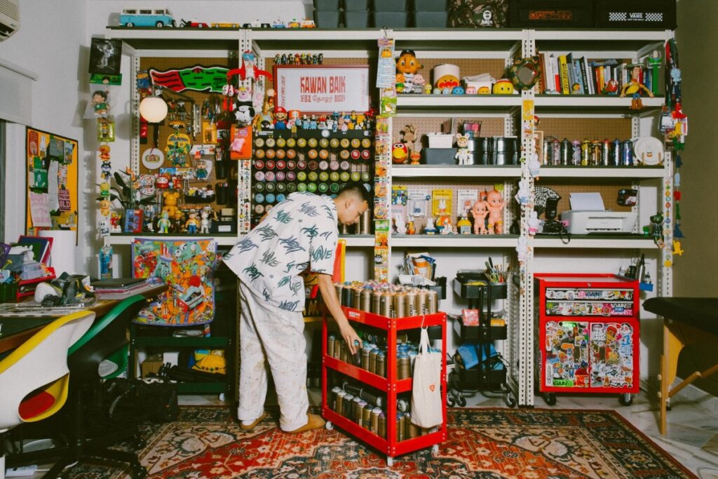 Không gian studio là trọng tâm của ngôi nhà, được bố trí nhiều kệ mở bằng kim loại trắng, xếp đầy sơn xịt, mô hình nhân vật, sách nghệ thuật, bưu thiếp, đồ chơi.