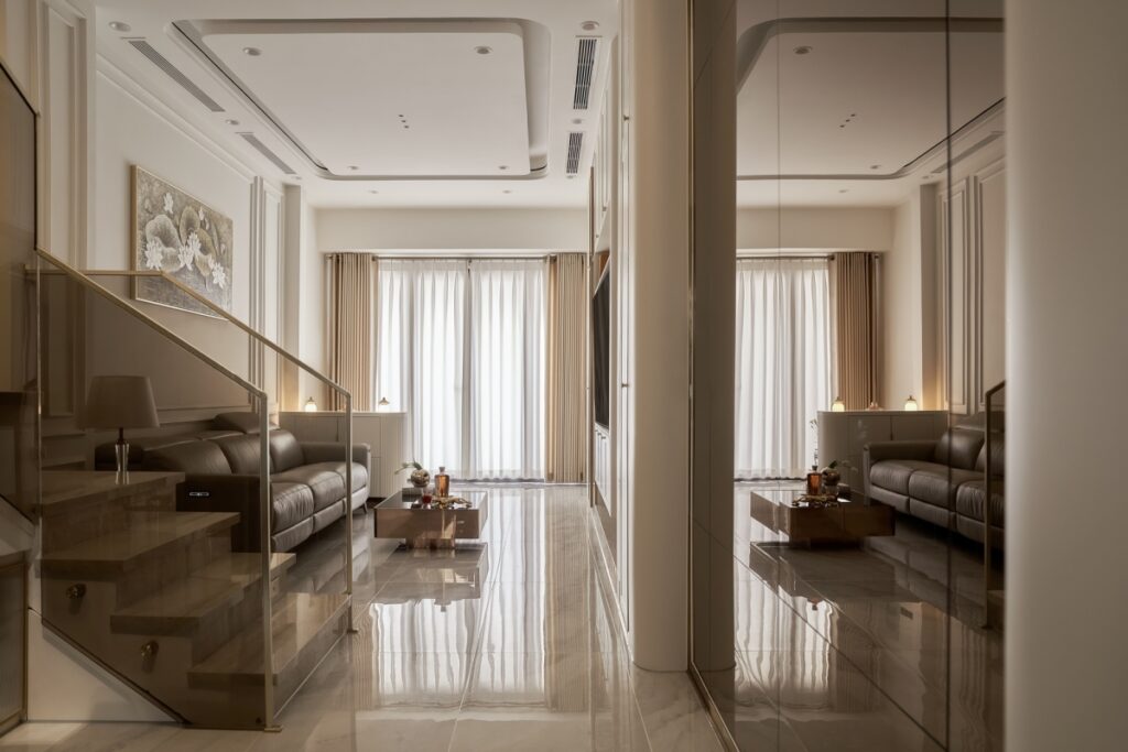 Phong cách tân cổ điển được thể hiện theo hướng tiết chế, tránh áp dụng các chi tiết trang trí dày đặc. Gam màu sáng như trắng kem, be và xám nhạt được sử dụng làm nền chủ đạo, hỗ trợ mở rộng cảm giác không gian trong điều kiện mặt bằng hẹp.