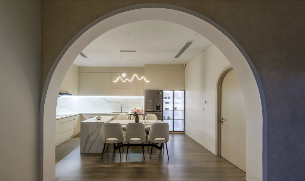 Các không gian sinh hoạt chung được mở rộng theo chiều ngang, kết nối liên tục với nhau. Hệ vòm cong xuất hiện tại những điểm chuyển tiếp, kết hợp với cao độ trần được xử lý linh hoạt, tạo nhịp điệu không gian liền mạch.