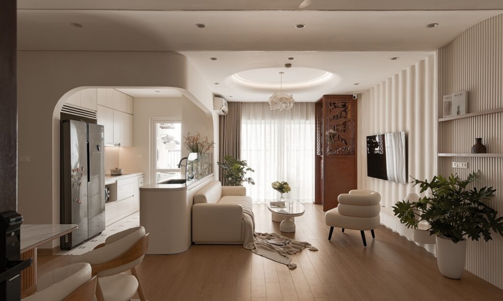 Vách tivi uốn lượn đóng vai trò điểm nhấn, tạo hiệu ứng chuyển tiếp mềm và cảm giác chuyển động liên tục trong không gian.