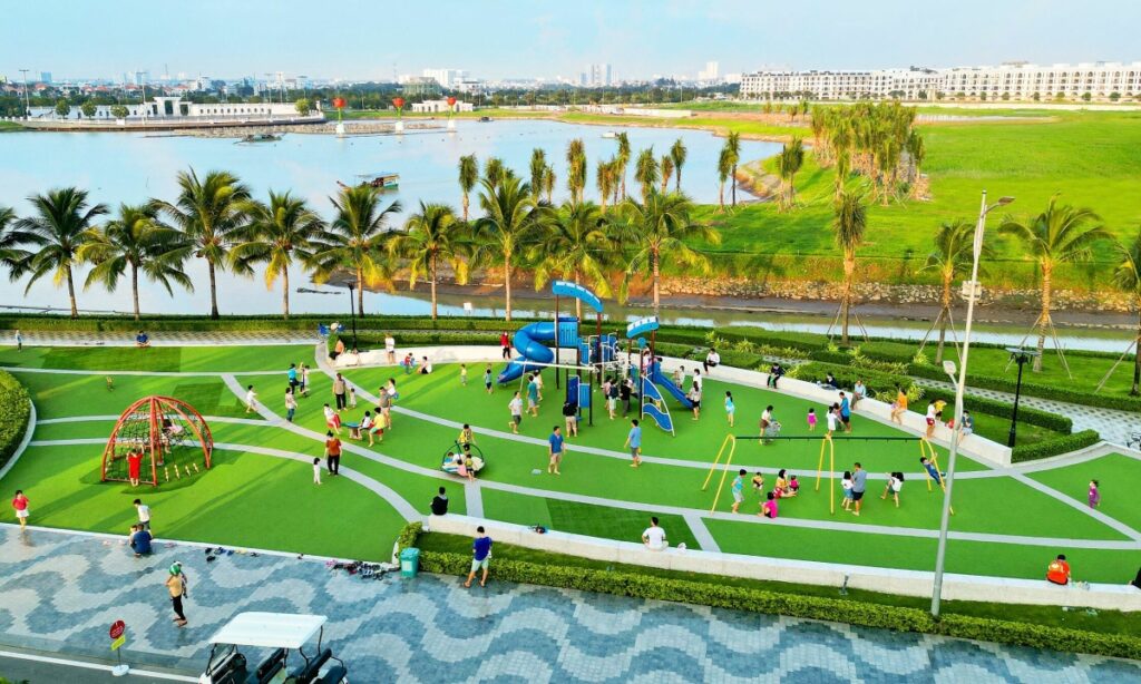 Cư dân vui chơi trong không gian xanh ven sông. Ảnh: VPG